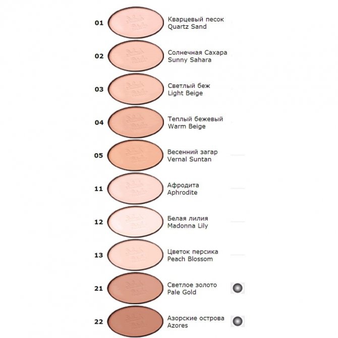 Легкая консистенция пудры придает коже естественный матовый цвет и маскирует небольшие дефекты. Чистые тона палитры специально подобраны к оттенкам кожи европейских женщин. Стойкость после нанесения составляет 5-7 часов. Отлично предохраняет от ультрафиолетового излучения.